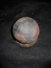 Here is a very nice Susquehannock pitcher pottery vessel. I modeled this one after a picture of an original that is on display in the Rochester Museum. The pot was hand coiled, hand paddled, decorated with hand tools and cordage wrapped sticks. The clay is a self hardening clay that does not need to be fired. I choose this medium to insure that the pot will never crack or fall apart like some of the original clay fired ones do. I aged this pot to look like it came out of the ground. This is a museum grade replica and I only make about 8 or 9 each year due to the amount of hours put into each one. |