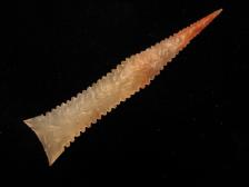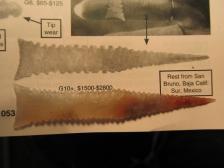 To quote Monty Python, "and now for something completely different". This is southwestern style San Bruno point, a type found down into the Mexico Baja area. Not tried one of these before so I was pleased with this first one out of the chute. Material is pigeon blood agate with red in the tip area but a mostly clear body. I laid this down on the page in the Overstreet artifact type book for comparison as you can see in the last photo. This was actually kind of tricky to do almost like a Hohokam point. So, for you SW point fans, here you go..... |