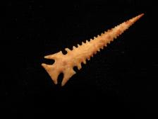 This nice skinny little SW style Neff point is made out of a piece of peach colored Flint Ridge flint with red spots in it. It sort of looks like it has the measles or a pox of some kind. Don't worry, its not contagious. Most of these points were quite slim and very skinny almost like a serrated drill really. |