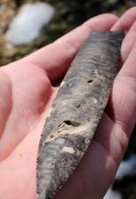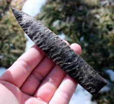 This long, slender Saint Mary's Hall point is made from milk and dark chocolate colored Oil Chert and is riddled with cavities, hence the name "Sweet Tooth". |