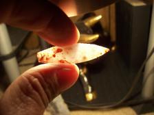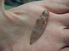 I Knapped this littlt Agate Basin style Mini Point out of a Variety of the famouse Pigeon Blood Agate.We call it SYCO AGATE.You can see why.Totaly Awsome material.On one side it gave me a little trouble, but knapped threw it and it finished Nicely.Thanks for your interest and be Safe.Will combine shipping. |