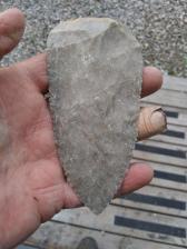Nice butted knife I percussion knapped from a piece of Texas flint. This type of knife has been used by all cultures and was referred to as a Kerrville knife in Texas.. It is a sharp and functional tool that would be good fro fleshing hides or skinning game animals... It measures 4 5/8" long x 2 3/8" wide. |