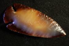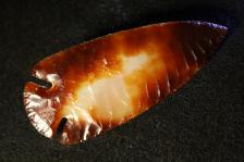 This is a beautiful Agate Dovetail. It is two points in one. The two sides are very different. One is basically what a I like to call "Moonstone Agate." The other is a rich brown agate with a golden white eye. The flaking is extremely uniform and the notches and edging are very percise. The is a glossey piece of art. |