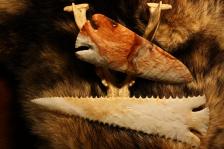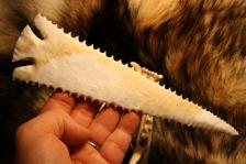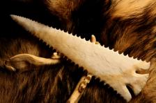 This incredibe serrated Pinetree was knapped from snowy white Piaute Agate. The colors of the point in conjunction with the large, extra sharp serrated edges and deep narrow notching makes this spear point a collectors dream. |