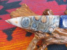 A once in a lifetime piece of lithic art. This knife is made from very unique Brazilian Agate with blue and orange orbs. The handle is made from Lapis Lazuli with rich dark blue colors. This knife truly showcases the beauty of the stone and Randy's ability as a flintknapping artist. It is signed and dated. Please call (417-733-4155) for more information. |