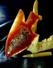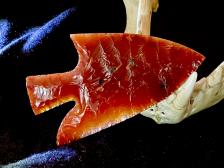 Here is a unique point both in style and quality of stone. This is an amazing piece of fiery orange/red Piranha Agate . The point has exceptional mass and weight with a great lenticular profile. It was very glassy for the most part, allowing for a great flake pattern. Due to the shape I decided to copy an old Alaskan harpoon style made from bone. The point came out beautiful. It’s a bigger point and will be a special addition to someone’s collection. |
