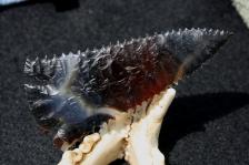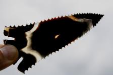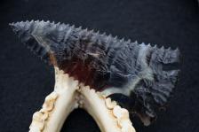 This incredible Serrated Pinetree was knapped from Black and Burgandy Agate with lightning bolts The colors of the point in conjunction with the extra sharp serrated edges and flake patterns makes this spear point a collectors must have. Top that off with the narrow notching makes this one special. |