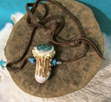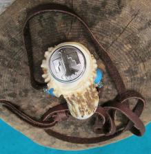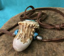 This is unique neckwear for a guy or a gal! This whitetail deer stag crown jewelry piece is buffed, shined & comfy! Anchoring the piece & proudly displayed, is a silver finish – Thunderbird medallion. A nice soft deer skin lanyard holds the turquoise & silver beads . A handsome & unique item to get you noticed at the next Pow Wow or knap-in! Antler pendant is 2 1/2” tall. (Shipping will be $5.00 on this). |