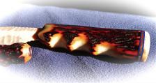 I wanted to make a knife where I pulled out all the stops & didn’t hold back on any effort or expense. Here it is! You’re getting size, exquisite materials, Style, comfort & balance, & a harmony of color. Fit & finish was accomplished under a magnifying lens. The big Bowie blade is awesome, & copper tones permeate throughout all parts of the knife. It starts with a prime Elk stag antler handle – done up & stabilized in sunburst “amber stag”….cream, yellow, red, & brown. Finger grips have been carefully added in just the right places. Copper & other spacers tie-in the pommel cap – which is a choice piece of fossilized coral. A very tight epoxied fit at all places. The blade is flaked to perfection out of a 60+ year old slab of vitrified structural glass. (Nearly as hard & shiny as obsidian). I fashioned the stand out of pine wood & it is texture-painted. The rear prop has a nice design of silver tone accents. (I normally sell my “WA” key chains for $10.00, but I am throwing one in with this ensemble at no charge - It also has the “amber stag” treatment to match the match the knife). All is hand rubbed & polished to a high luster – with nary a scratch anywhere. You will not be disappointed! |
