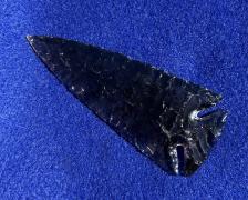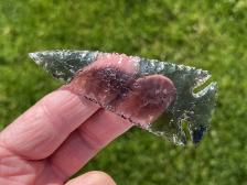 This dovetail point is made from some translucent obsidian that is actually midnight lace obsidian but it only has a trace of the lace in one corner of the base. Nice flaking with a good edge. |