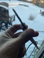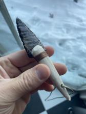 A translucent Obsidian point set in a small antler tine tip. Blade is hafted. Artificial sinew wrapped around the base. Would be a neat gift for a young kid / outdoorsy person!