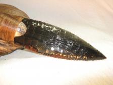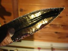 What a nice, unique knife. It is 9 inches long and this very nice dagger or paleo blade has been knapped out of a midnight lace Obsidian with some red along the cutting edge. This handle is a very nice Elk antler piece with a nice walnut end cap. This is such beautiful knife for the flint knapping collection or to resell at a pow wow or rendezvous. The blade has been hafted to the antler handle with resins and artificial sinews. This piece does come with a certificate of Authenticity. It will have a picture or your knife and a brief description and will be signed and dated by the Artist.
