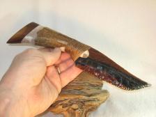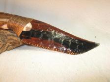 What a nice, unique knife. It is 10 1/4 inches long and this very nice blade has been knapped out of a triple flow Obsidian. The back lit pic will do for a better description. This handle is a deer antler piece with a nice walnut end cap.