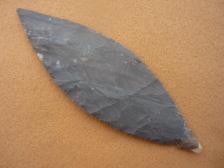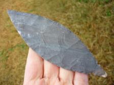 A nice, dark gray Turkey Tail, done right, with cortex on the tail, by master flint knapper, Jim Redfearn. This Turkey Tail, out of Indiana Hornstone, was knapped at the Fairview Heights Knap-in, June 2004. Signed and dated, in cursive with a diamond scribe: Jim Redfearn 6-5-04 |
