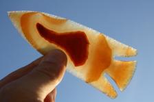 Here is a large Winged Lost Lake, or maybe two. This point has two destinct faces. Both are beautiful pieces of agate. The point has very detailed, and sharp, edging and extremely narrow deep dog legged notching. this is a very nice point. the photos were taking outside in evening sunlight. |