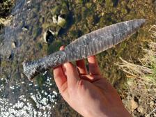 An early style type 4 dagger knapped with dagger period tools, antler percussion and copper punch/pressure. I also spent significant time hand grinding the blade on a sandstone block for a period fogged blade. |