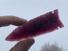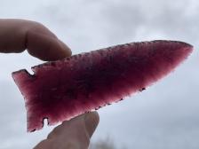 Rich violet-colored glass was pressure-flaked into this side-notched arrowhead. The result is a sharp, bright piece filled with color.