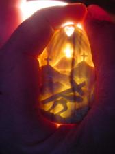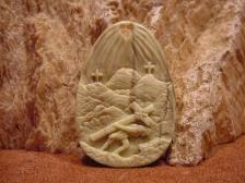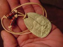 What I really like is when held up to bright light the cross from the the reverse side shines thru the stone. I carved a heart shaped loop and strung it with brown leather cord and some "olive oil" trade beads.