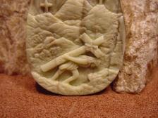 the carving is very detailed and the stone is polished like glass . This is made into a necklace but not limited to that as it could be a broach, it could even be bezeled in silver or gold.