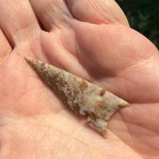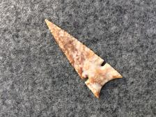 Nicely done Washita arrow point out of Texas Alibates. Knapped by master flint knapper, Bob Thomas. Cream and brown. From the Elby Short Collection, Arkansas. Knapped in the 1980’s. |