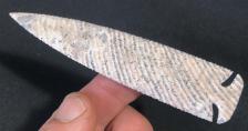 This unusual material I call White Tiger Flint came from Tanzania. I obtained it a few years back at a rock show and haven't seen any more since then. I have only a few pieces of it left and hoping to come across some more. This Dovetail I knapped has been a source of enjoyment for quite a while, but it's time to let someone else enjoy its unique beauty. |