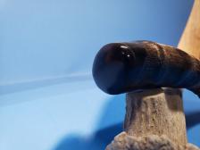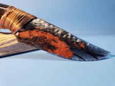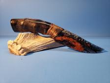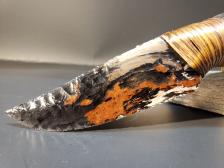 I made 2 springbok knives this week. This being the smaller at 7 3/8 inches. The springbok handle is blacked out with a buffalo horn capped polished to a high standard of lustre. The beautiful knapped blade is Midnight lace obsidian. (I'm sure I'll get some resistance to the name) This blade has been tested and passed cutting commercial grade hog leather |