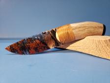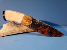 The Wicked Lace Obsidian blade is sharp and has superb flaking. The handle is polished antler with a buffalo horn cap and tight sinew wrap at the haft making a fine transition from handle to blade creating line and flow.