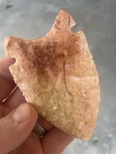 A high grade, Red/orange/pink/yellow waxy Burlington side-notch. Percussion knapped from Burlington biface. This has unique rice grain fossils throughout the stone!