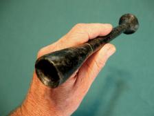 This is an awesome wineglass style tube pipe. The name wineglass was given to these pipes by modern day collectors, for obvious reasons. This style tube pipe highlighted the skills of the early pipe carvers. Many show slender tapered lines in amazingly long pipes, many made from steatite. This tube pipe is carved from very dark steatite, and is impressive in length, approximately 9 inches long. The bowl is conically drilled with thin walls and the mouth piece is flared. There is a crystalline inclusion in the stone right where the bowl begins to flare.