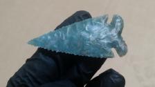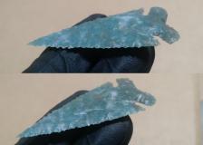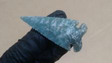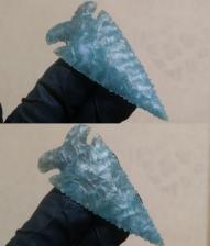 Nice, lean Wintu point with needle tip, in teal green India Jasper. Well flaked, very nice gloss and smooth surface. Very unique looking material that looks great back-lit as well. Although i dont know for certain, id bet this material comes from the same formation as the Bloodstone out of india, as there are some striking similarities.