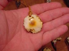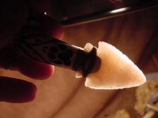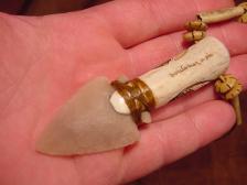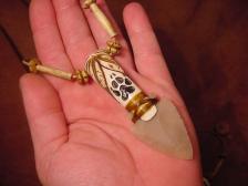Offered here is very Beautiful carved antler arrowhead necklace with a wolf track carved on the front of the handle, two eagle feathers flow around it from the top..... the arrowhead I made from Navaculite and has a beautiful translucent peachy color when held to light....I strung the necklace with genuine bone beads and brown leather cord. |