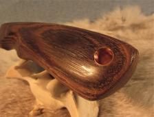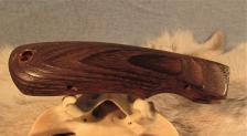 This one will make a really nice looking knife ensemble! I’ve made this from a slab of Wormy American Chestnut wood, & then flamed it to a deep, rich, darkened, aged appearance. As you can see in the pictures, the flaming removes a little of the softer wood & the annular growth rings remain….leaving a beautiful and textured grip. I’ve made it even more classy with the inlay of a copper lanyard hole liner. It is 5 ¼” long, & is pre-slotted & shaped for a blade. All is buffed & polished to perfection. Please add $6.00 for shipping & insurance. |