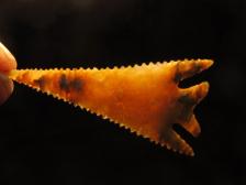 Nice serrated Elko point of a type often found in SE Oregon and N. Nevada. Not sure where the agate is from other than from the NW someplace. Its a sort of translucent honey-yellow colored material with some banding in it. Very pretty stuff so I tried to do the piece justice |