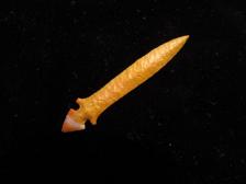Nice NW style dagger point made out of yellow Oregon sunset jasper. with a clear streak band in the back tang Fine little ribbon flakes like on the originals. Its thought that dagger points were part of a man or warriors necklace as they're too small to haft on arrows and have been found in clusters around the neck region of male internments in past years. They're not common and can be tricky to make to say the least |