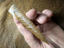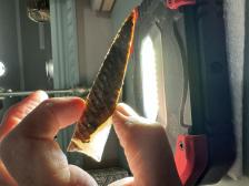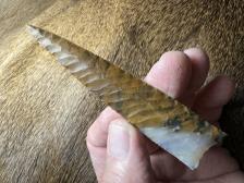 Made from beautiful Polkadot agate from Oregon! Nice narrow parallel oblique flaking and serrated sharp! Hafting area is ground, thanks for looking! |